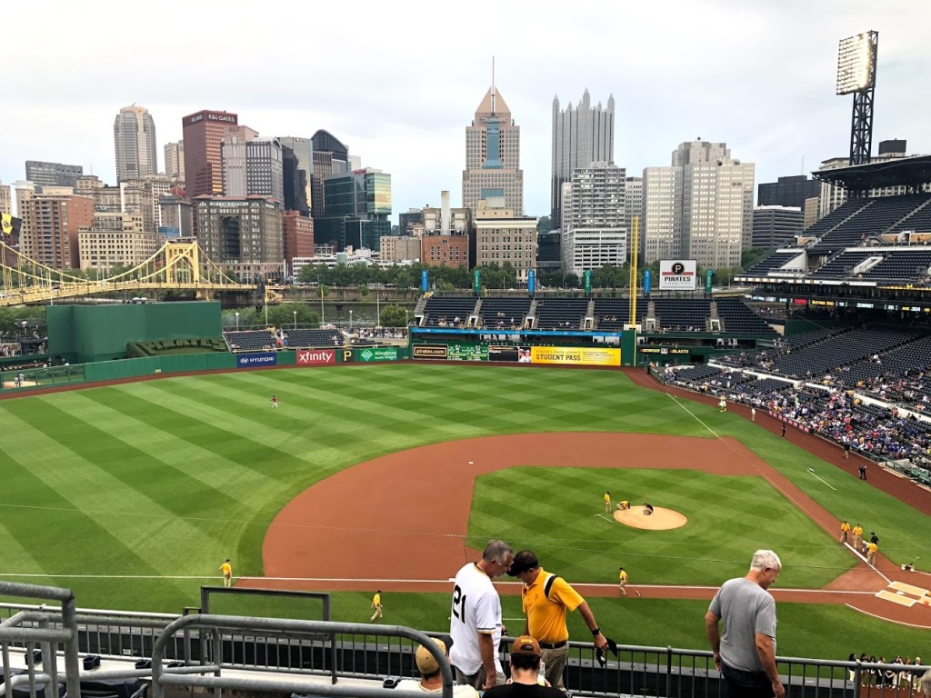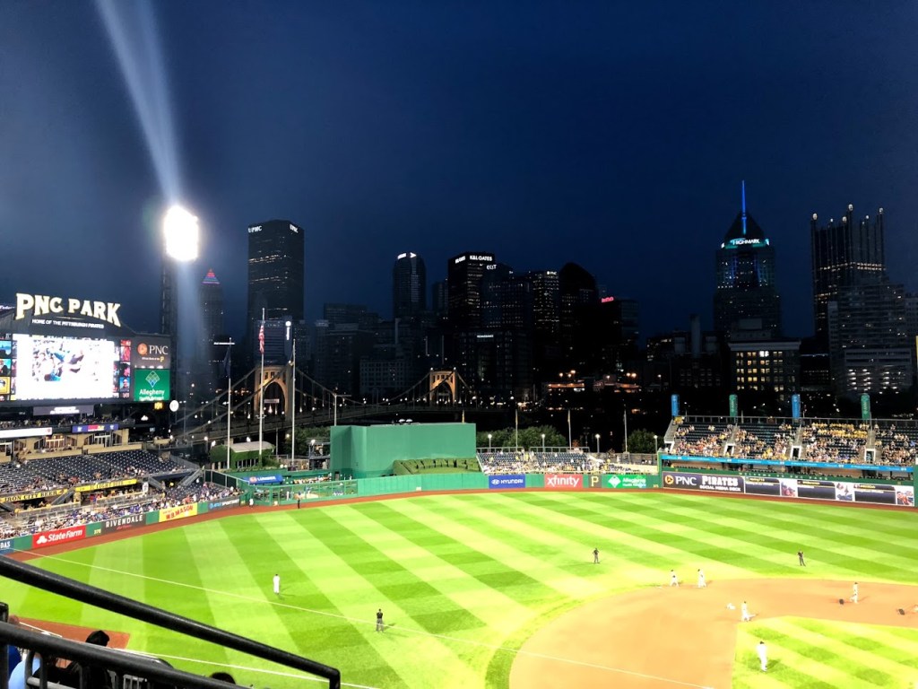 We got absolutely soaked walking across the bridge! We stopped for a drink at The Beer Market where I tried an awesome banana bread beer. We then walked down to the Pittsburgh Fan and I brought a Pirates jumper to keep me warm. Dinner was tacos from the Steel Cactus across the road and then it was time for the game.